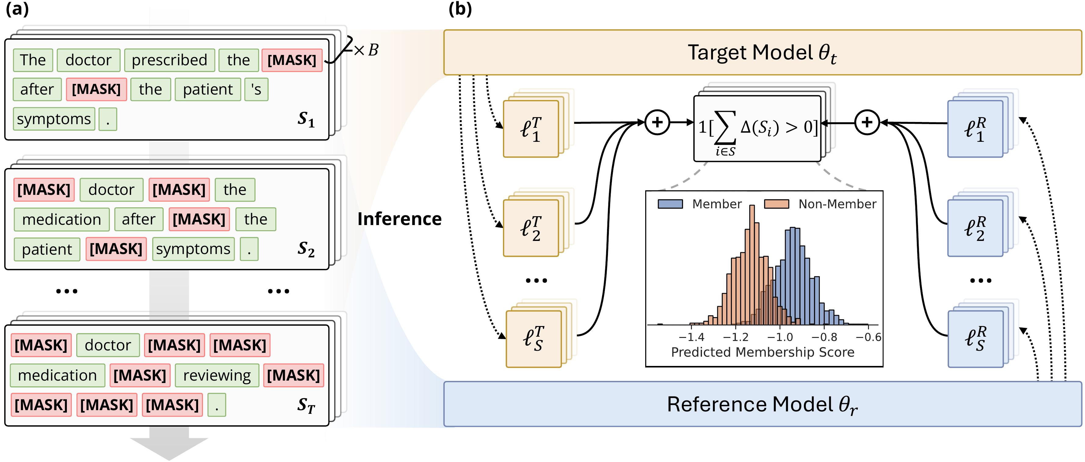 \[\Delta_{\text{DF}}(\mathbf{x}; \mathcal{S}) = \frac{1}{|\mathcal{S}|}\sum_{i \in \mathcal{S}} \left[\ell^{\text{R}}_i(\mathbf{x}, \mathcal{S}) - \ell^{\text{T}}_i(\mathbf{x}, \mathcal{S})\right]\]where $\mathcal{S} \subseteq [L]$ is the set of masked positions. Since $\mathcal{S}$ can be any subset of $[L]$, the attacker has up to $2^L$ possible mask configurations to try, each an independent experiment that can reveal different memorization patterns.