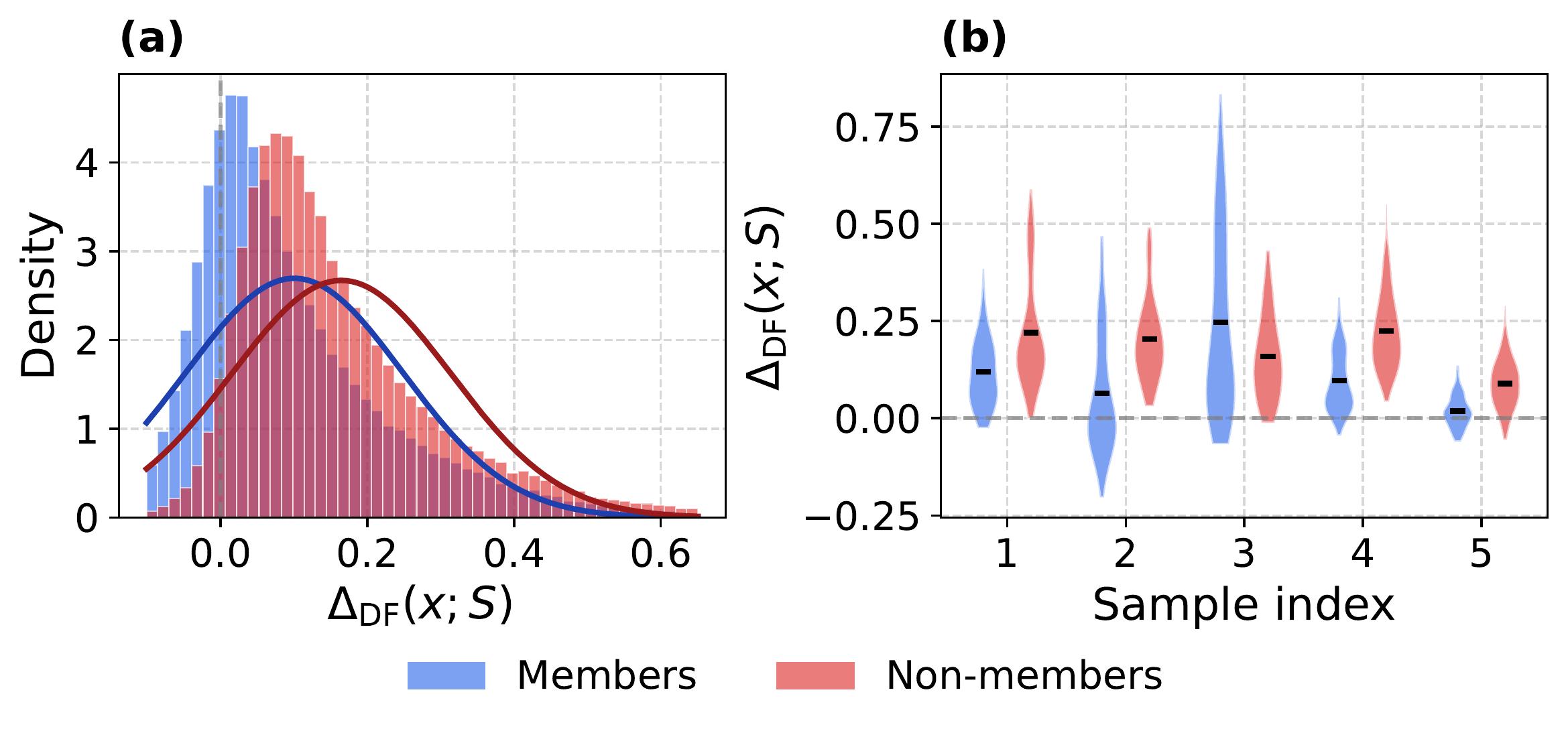 \[\Delta^n_{\text{DF}}(\mathbf{x}; \mathcal{S}_t) = \frac{1}{m}\sum_{i \in \mathcal{U}^n} \left[\ell^{\text{R}}_i(\mathbf{x}, \mathcal{S}_t) - \ell^{\text{T}}_i(\mathbf{x}, \mathcal{S}_t)\right]\]Each subset excludes different tokens, so a domain-specific outlier that dominates one subset’s signal appears in only a fraction of the $N$ measurements. Consistent membership signals, on the other hand, accumulate across most subsets.