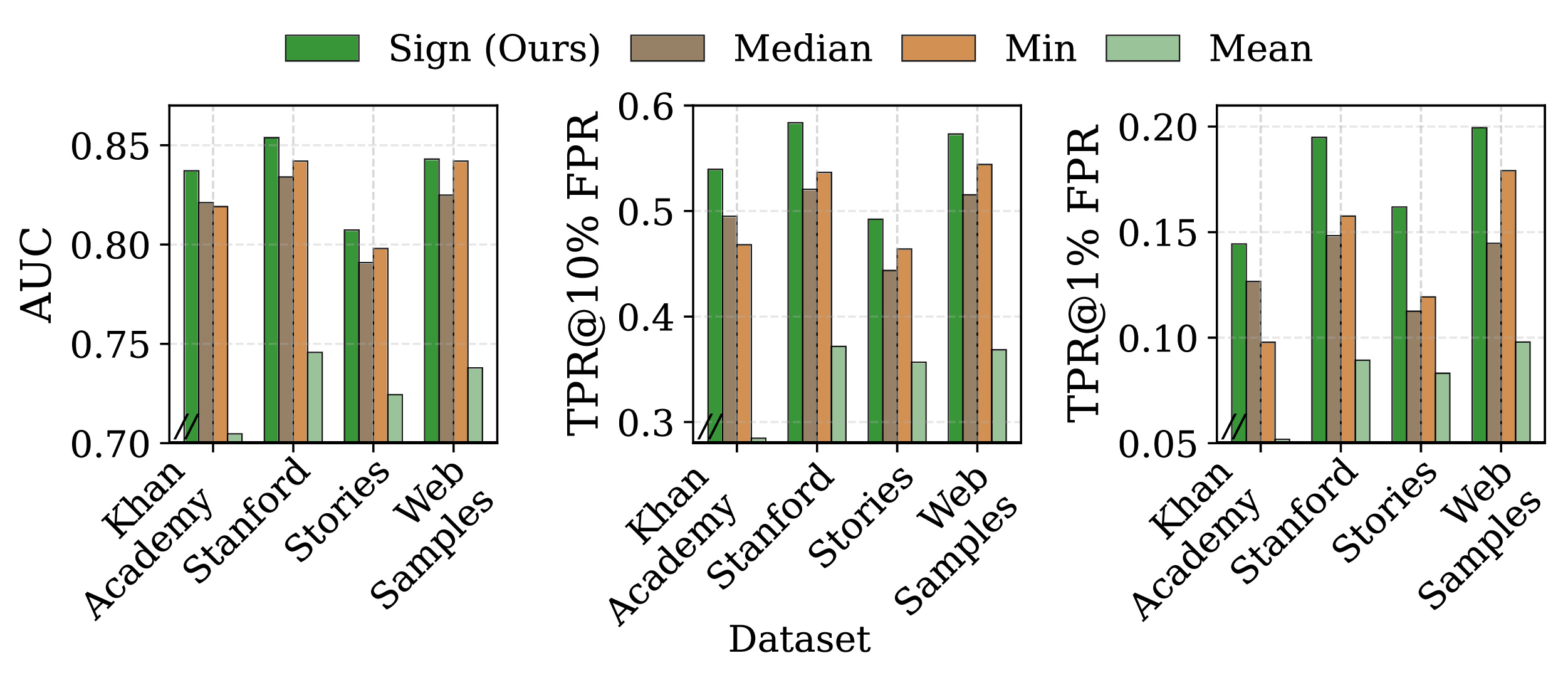 Sign beats mean. Replacing sign-based aggregation with mean-based aggregation causes a 2.2$\times$ drop in TPR@1% FPR, confirming that robustness to outliers is critical in practice.