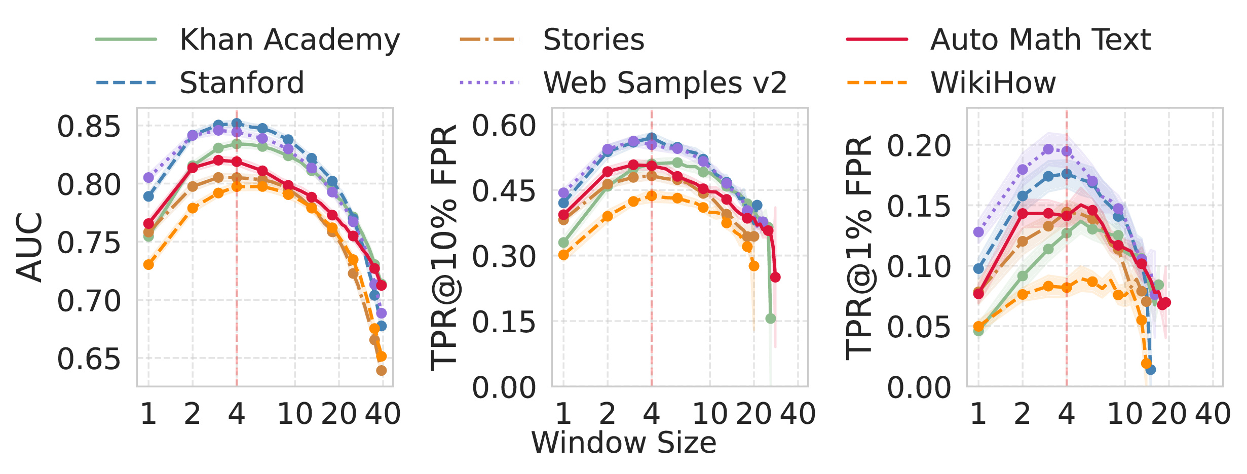 Window size matters, but ensembling removes the guesswork. Individual window sizes show a clear trade-off: optimal sizes typically fall in the 3–10 token range. But the ensemble consistently matches or exceeds the best single window, with an average improvement of 1.6% AUC and 16% in TPR@1% FPR. This means practitioners don’t need to tune window size per dataset.