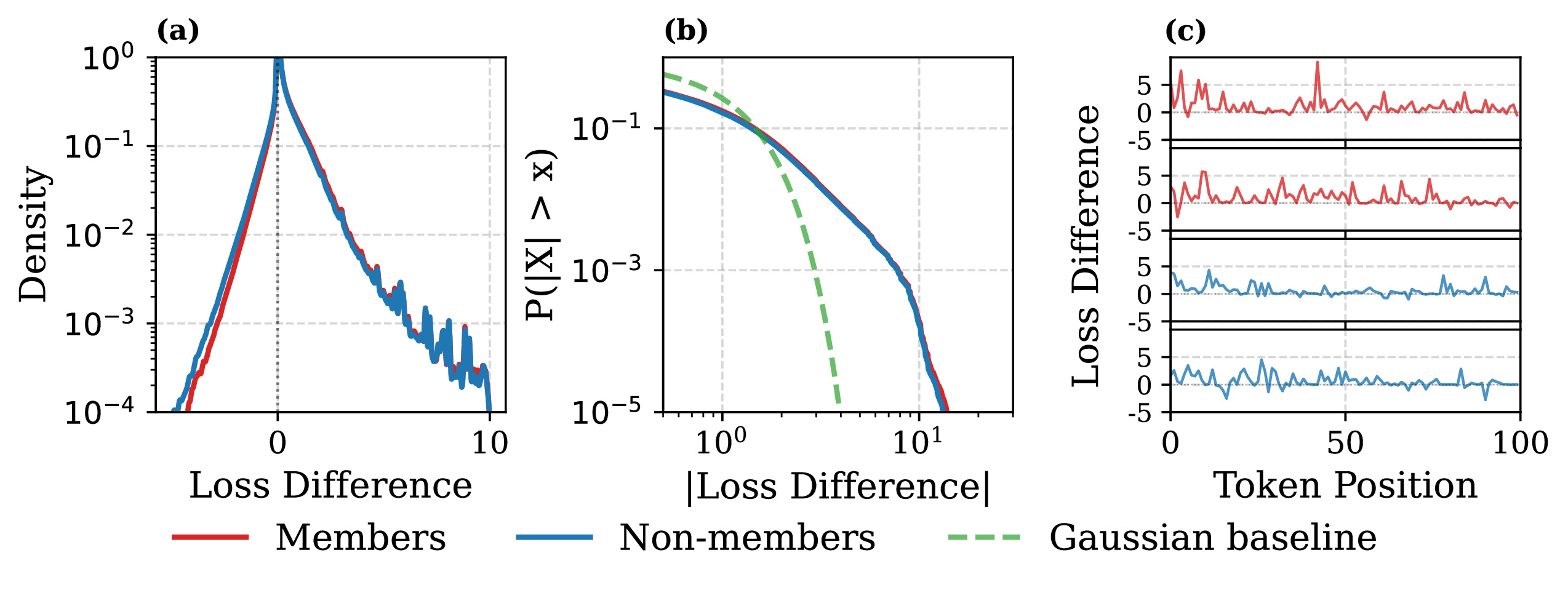Second, the tokens where the fine-tuned model dramatically reduces loss compared to the reference (the right tail) are not reliable membership signals. These are domain-specific tokens (technical terms, formatting patterns) that the model learns regardless of whether a specific sample was in the training set.