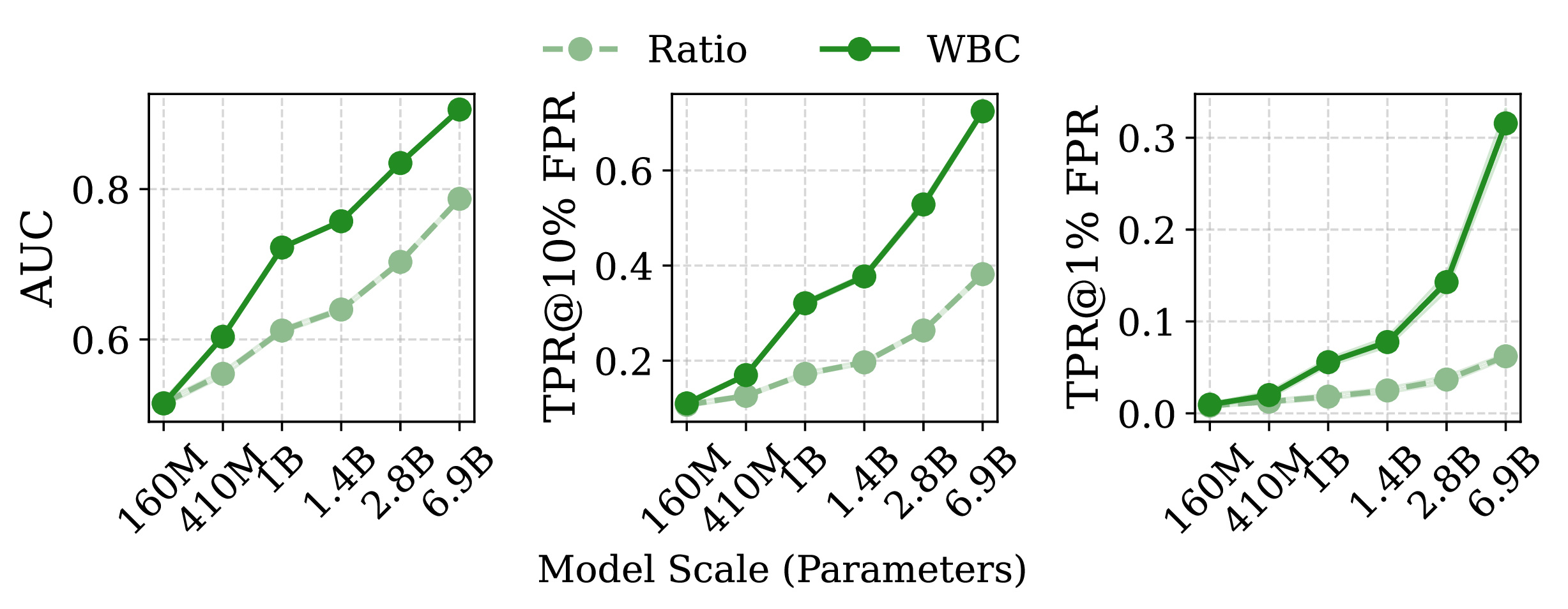 Two key findings: first, vulnerability increases with model scale. Larger models memorize more, and WBC consistently captures this. Second, WBC works across fundamentally different architectures: the same algorithm, with no modifications, is effective on both transformer-based and state-space models.