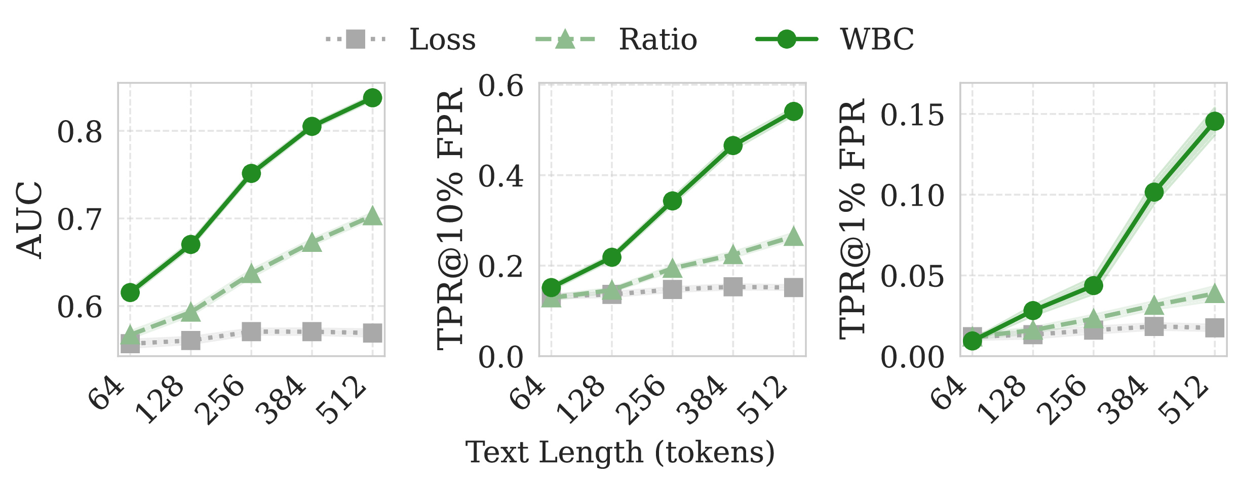 Longer text helps, and super-linearly. Scaling text from 64 to 512 tokens yields a 7.1$\times$ gain in TPR@1% FPR, compared to only 3.6$\times$ for the Ratio baseline. WBC benefits more from longer text because it extracts more independent windows.
